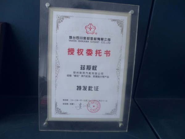 证书编号: 0004 证书名称: 授权委托书 发证机构: 烟台石川密封垫板有限公司 生效日期: 2011年07月01日 截止日期: 2013年07月01日 认证简介: